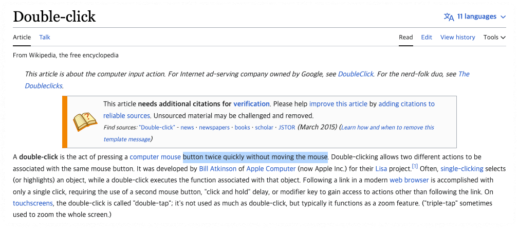 위키백과에 따르면 더블 클릭은 움직임 없이 버튼을 두번 '빠르게' 누르는 것이라고 설명한다.