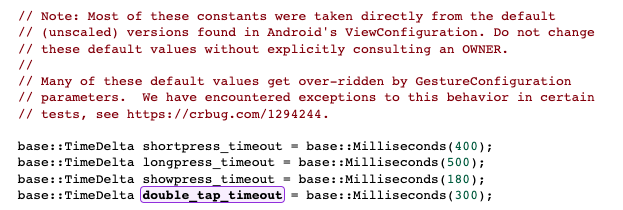 어찌되었건 더블클릭의 시간에 대한 표준이 없다면, 실질적인 표준 규격을 찾을 수밖에 없다. 그 말인즉슨, 오픈소스 브라우저 중 가장 많이 쓰이는 크로니움 소스를 볼 수 밖에 없다는 뜻이다. 사실 코드를 살펴보는 과정이 가장 중요하지만 전혀 다른 이야기이니 생략한다.