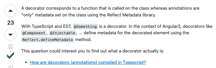 사실 데코레이터의 하위 요소로 어노테이션이 있다고 볼 수 있다. 어노테이션은 뒤에 오는 필드에 메타 데이터를 기록해 두는 일종의 마커이고, 데코레이터는 뒤에 오는 대상을 감싼 고차함수를 만드는 것이다.