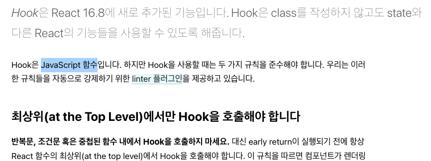리액트 문서에서도 재미있는 것을 발견할 수 있다. 리액트의 훅을 자바스크립트 함수라고 표현하는 것이다.