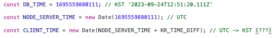 더 무서운 것은 노드 서버의 경우이다. DB에 저장된 날짜와 노드 서버의 날짜, 그리고 stringify되어 전달되는 클라이언트로의 날짜 이 모든 것이 정확히 일치되리라는 법이 없다. 서버의 시간을 명확히 알지 못한다면 아래와 같은 일이 생길 수 있다는 것이다.