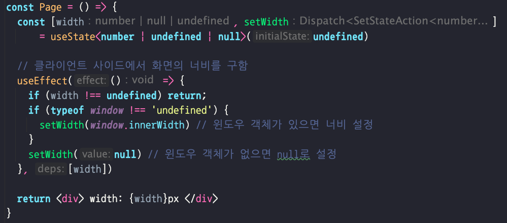 개발 중엔 이 관계가 모호하다 보니 많은 사람들이 undefined 자체를 사용하지 않는 경우가 많다. 하지만 특정 상황에서는 사용하는 것이 오히려 더 명확할 수 있다. SSR을 하는 경우를 예로 들 수 있다. 클라이언트에서 실행되어 화면의 너비를 저장하는 상태가 있다고 치자. 이 때 서버 사이드에서 실행되는 코드에서는 너비가 어떻게 될까? 물론 흔히 사용하듯 null로 처리할 수 있다. 하지만 window 객체에 접근이 가능한지 엄격하게 처리해야 하는 상황이라면 아래와 같은 코드로 처리할 수도 있다.