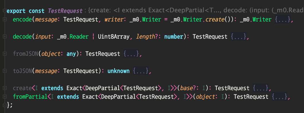 위 코드에서 볼 수 있듯, JS 진영의 코드라고 보기에는 어려움이 있다. TestRequest 타입이 네임 스페이스로 선언되어 있을 뿐더러, Request가 클래스로 구성되어 있어 new 키워드로 객체를 만들어 낸 후, 각각의 필드를 set 메소드로 업데이트 해야 한다.