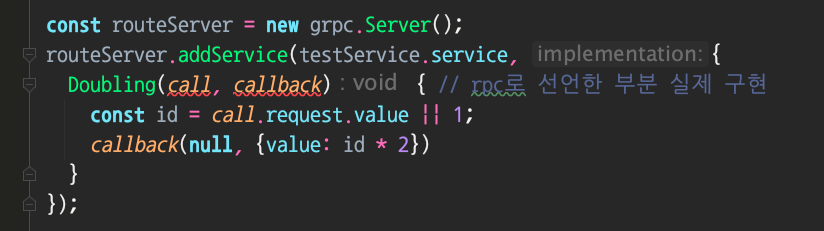 이렇게 정말 작은 코드만으로 외부 시스템에서의 요청에 응답하는 서버가 구성된다. 이 방식은 비교적 최근에 만들어진 웹 프레임워크나 소켓 통신 프레임워크와 아주 유사하다. 단지 이 코드가 웹이 아닌, gRPC 클라이언트로만 호출이 가능하다는 점이 큰 차이다.