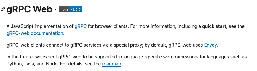 이 글을 쓰게 된 가장 큰 이유이다. 난 위 기능들이 궁금하기도 했지만, gRPC가 브라우저에서의 요청도 대체할 수 있으리라 기대했다. 바로 이 grpc-web이라는 프로젝트 때문이다. 이름이나 설명 자체가 브라우저에서 gRPC 서버를 호출한다고 설명되어 있지만 두번째 줄이 더 중요하다는 것을 간과했다.