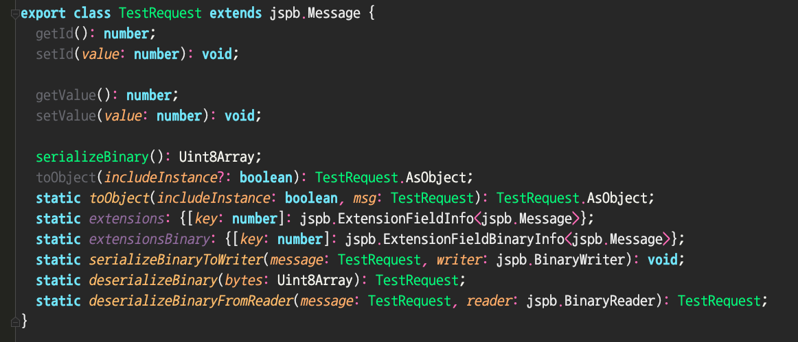 위 코드에서 볼 수 있듯, JS 진영의 코드라고 보기에는 어려움이 있다. TestRequest 타입이 네임 스페이스로 선언되어 있을 뿐더러, Request가 클래스로 구성되어 있어 new 키워드로 객체를 만들어 낸 후, 각각의 필드를 set 메소드로 업데이트 해야 한다.
