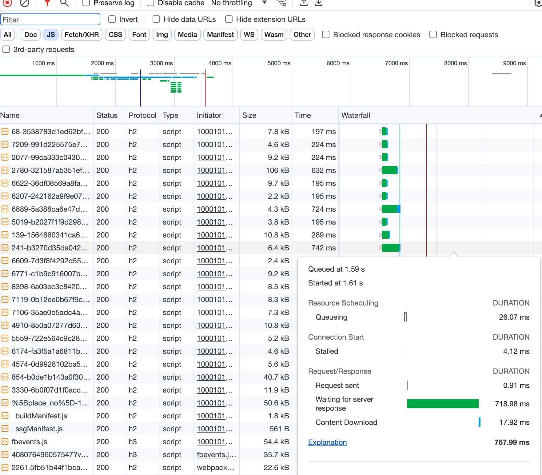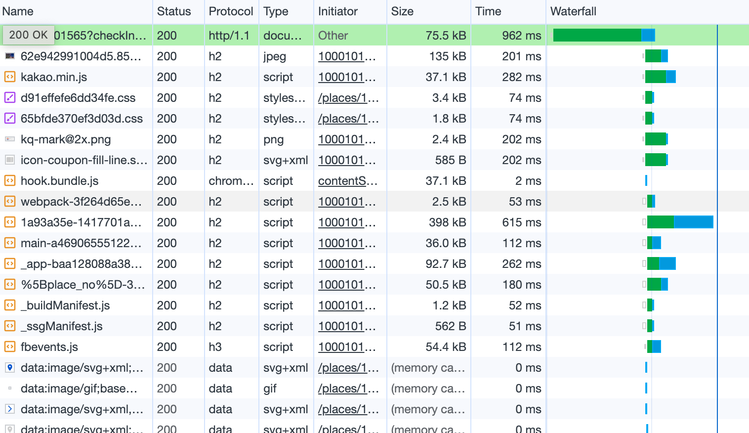 - 앱에서 static 파일들을 캐시하지 않는 상황으로(매번 삭제하고 있음. 다른 문서를 통해 공유), 청크 파일 개수 및 HTTP2에 영향을 그대로 받는 상황