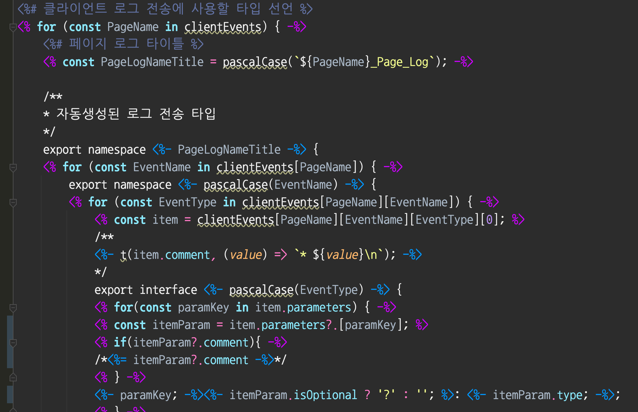 이쯤 와서 한숨을 돌렸다. 필요한 protobuf 데이터들을 읽어왔고, 객체로 뽑아냈다. 이제 언어별로 템플릿을 작성하고 템플릿 엔진을 이용해 파일로 생성하면 된다. 함수는 실제로 로그를 전송하는 로직이 담긴 함수를 호출하고, 파라미터로 입력받은 값이나 기본 값들을 모두 전달하는 것이다. 각 플랫폼이 모두 동일하게 map 형태로 담아 보내면 되기에 전송 자체는 어려움이 없었다. 다만 플랫폼별(언어별) 템플릿을 모두 작성해야 하니 이게 꽤나 복잡한 일이었다. 언어별 data class나 function, 그리고 optional이나 array 정의 문법을 모두 알아야 하니까.
