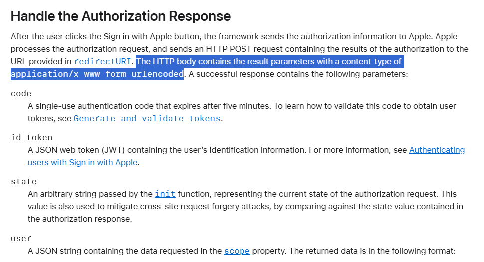 위 순서에서 주의해야 할 것은 먼저 토큰이 code와 access token으로 분리되어 있다는 것이다. 각 서비스마다 부르는 방식은 다르지만 이렇게 두가지로 분리되어 있는 것은 대부분 동일하다. 다만 서비스에 따라 code가 아닌 access token을 직접 전달하는 경우도 있다. 네이티브 로그인을 이용하는 애플이 대표적이다. 애플은 JS SDK 설정에 Redirect 방식을 명시하더라도 IOS라면 네이티브 로그인을 시도한다. 네이티브로 로그인되면 Redirect 없이 JS 코드 상에서 access token과 state를 획득하게 된다. 또, IOS가 아니라 Redirect URI로 이동되더라도 POST로 code와 state를 전송한다는 점이 다른 소셜 프로바이더와 크게 다르다.