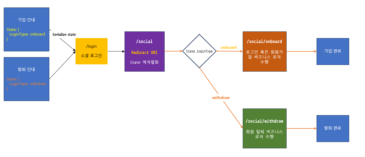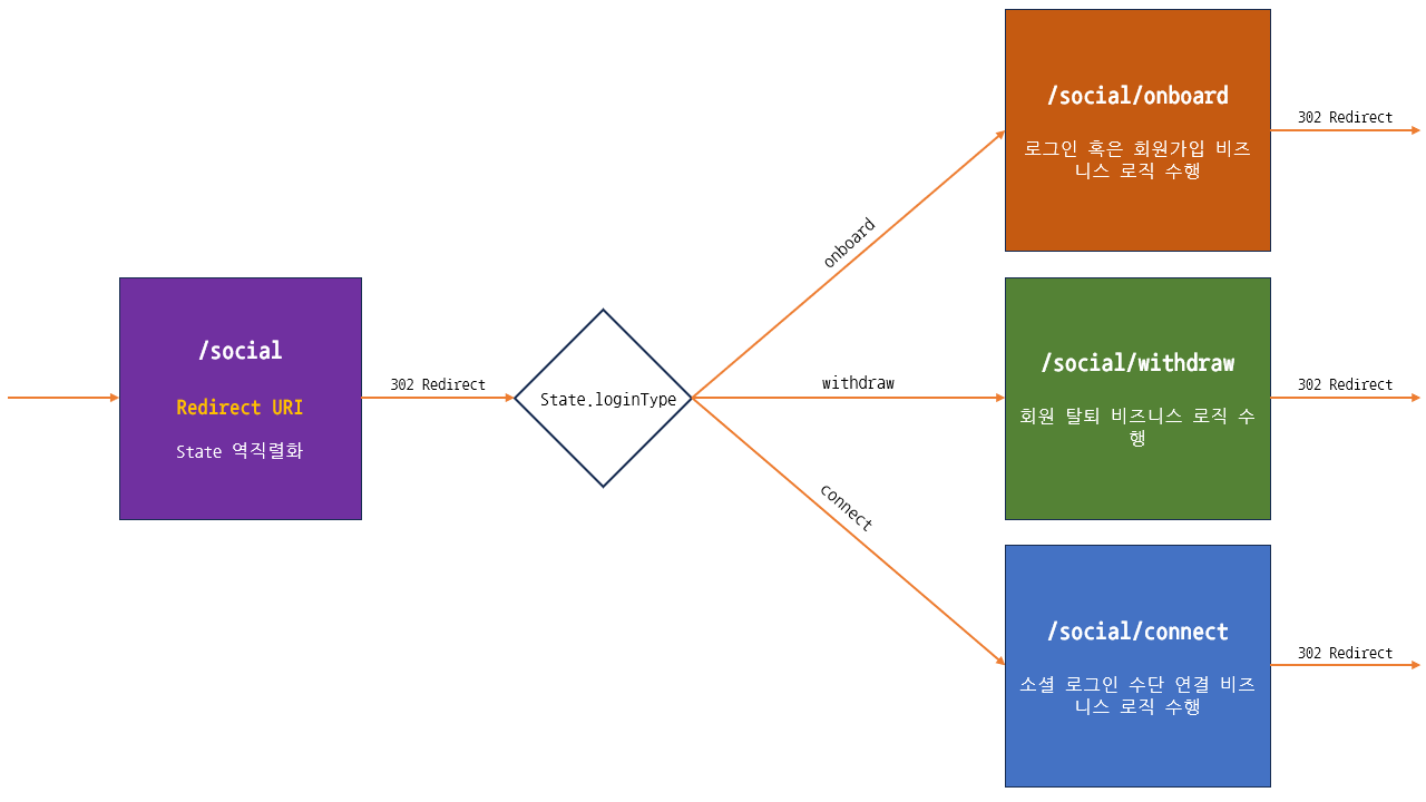 로그인이 완료된 후 이동한 Redirect URI에서는 state에서 확인한 액션의 구분 값을 통해 비즈니스 로직을 수행하는 페이지로 이동하도록 했다. 각 페이지에서는 주어진 역할만을 수행하고 다음 로직을 수행할 페이지로 리다이렉션 한다.