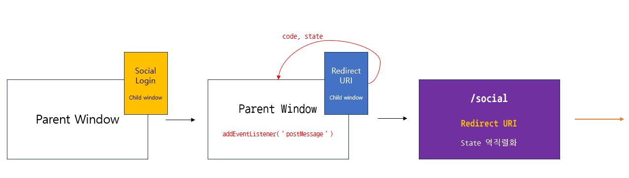 3번 역할 분리에서 URL을 분리하니 이 문제도 손쉽게 해결할 수 있게 된다. Redirect URI은 window.opener가 있으면(자식 창이라면) postMessage를 이용해 code나 state 등을 부모 창에 전달하고 창을 닫는다. 그리고 메시지를 받은 부모 창에서 3번에서 정의한 세부 URL로 이동하면 된다.
