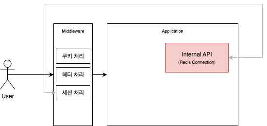 이 문제를 해결하기 위해, Edge Runtime에서 사용할 Internal API endpoint를 만들기로 했다. 어플리케이션의 API에서 Redis에 연결하고, Edge Runtime의 미들웨어에서는 이 API에 요청을 보내도록 하는 것이다. 그리 깔끔한 방법이 아닌 것처럼 보이지만, 이런 식으로 처리되는 라이브러리를 서비스를 하고 있는 곳도 있어 의외로 괜찮은 방법이라고 생각된다.