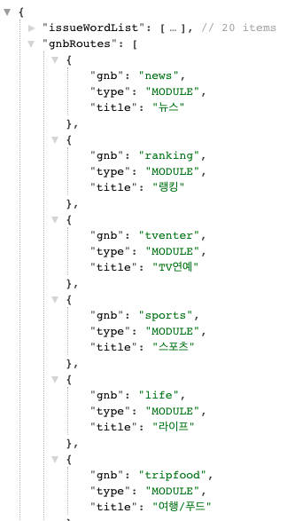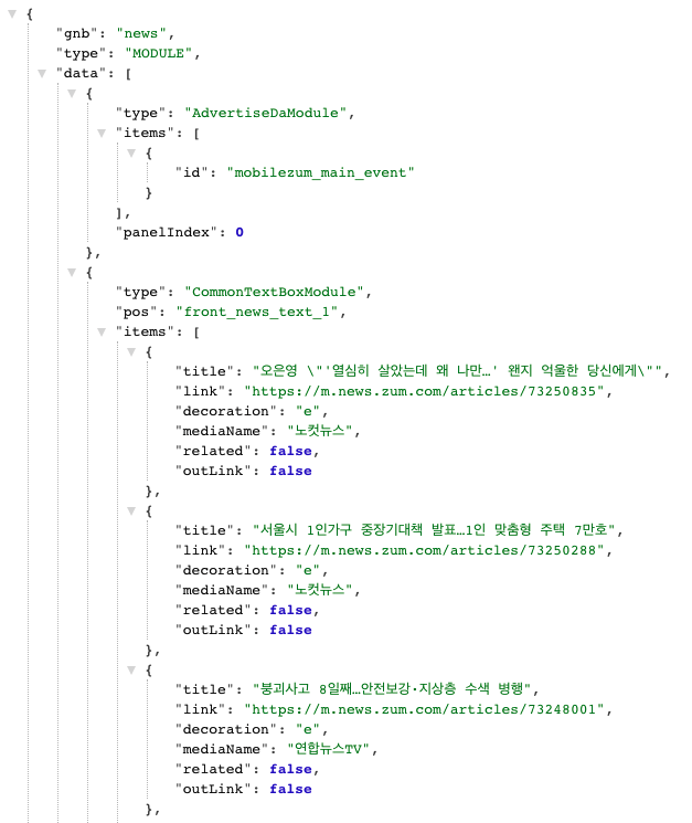 위 그림의 모바일 줌 닷컴이 이 단락에서 소개한 아키텍처를 적용한 프로젝트다(사내 정보가 아니라 클라이언트에서 호출하는 API다). 백엔드에서는 화면에 어떤 컴포넌트(data[].type)을 어떤 데이터로(data[].items) 그려낼지 전달한다. 상단의 탭 목록이나 이슈 검색어 뿐만 아니라 모바일 사이트의 컨텐츠 수직 정렬이라는 특성에 맞게 컴포넌트의 순서까지도 정해서 전송해준다. 만약 최상단의 텍스트 모듈을 이미지 모듈로 변경하고 싶다면 API에서 컴포넌트의 이름만 변경하면 될 것이다. 그런 '하찮은' 작업은 프론트엔드가 전혀 신경 쓸 필요가 없다.